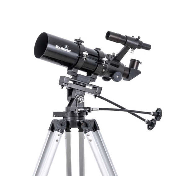 La lunette SkyWatcher 80/400 est installée sur une monture azimutale assez robuste. Le chercheur 6x30 permet un premier pointage rapide qui sera affiné grâce aux flexibles de déplacement fin sur les deux axes. Le budget de 250€ reste raisonnable. Elle est livrée avec deux oculaires de bonne qualité.